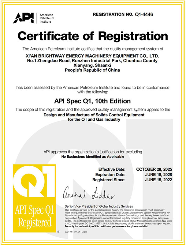 The quality management system certifications obtained by Brightway Solids Control Co., Ltd. include: API certificate; ISO9001-2015 quality management system certification; environmental management system certification; environmental occupational health and safety management system certification, etc.; industry qualification certifications obtained include: IADC drilling contractor qualification certification; product qualification certifications are: mud shaker CE certification by EU; mud cleaner CE certification by EU; drill cuttings dryer CE certification by EU; drilling fluid centrifuge CE certification by EU, etc.; mud agitator CE certification by EU; drilling fluid sand pump CE certification by EU, etc.
